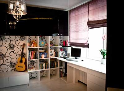 Автор проекта справился с этой задачей благодаря большой гипсокартонной конструкции, и в полученную нишу был встроен диван. Расширение пространства было достигнуто использованию контрастных деталей в интерьере, это элементы обоев с непременно крупным рисунком, подоконник чудесным образом, ставший письменным столом, книжные полки, как- будто только намеченные линиями, опять же благодаря тому, что находятся на фоне обоев, и их прозрачность и легкость обеспечена этим моментом.