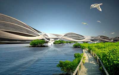 Наводнение для Бангкока самая экстремальная ситуация, так считают власти самого крупного города Таиланда, но не постоянным состоянием региона. А по прогнозам ООН к 2050 году здесь могут сформироваться сплошные болота, и эти факты еще подтверждаются загрязняющими этот регион факторами, которые страдают от выбросов тех ферм, которые добывают креветки. И в этом случае мнение специалистов архитектурной студии S+PBA, подсказывает, что спасти положение могут только надводные архитектурные структуры. И проект является Wetropolis - прогрессивным методом, как быстровозводимые здания.Это проект самоподдерживающегося плавающего комплекса, жизнедеятельность которого будет стимулироваться приливами и отливами.