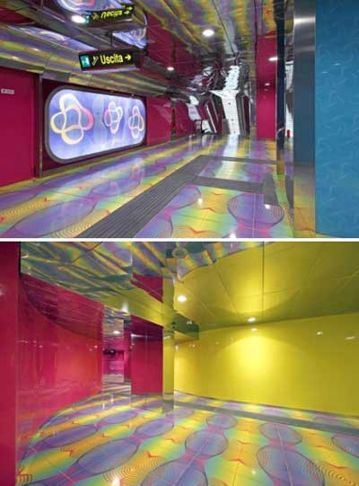 Это станция метро University of Naples в Неаполе (Италия). Карим Рашид очень знаменитый Ньюйркский дизайнер воплотил ряд своих футуристических идей в пространстве этой станции. Это самая многолюдная станция в городе. И спускаясь сюда в большом потоке людей, безусловно, поглощают энергетику прошедшего дня, не всегда позитивную.
